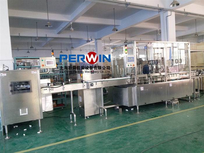 Deze hoge snelheidsnevel flessenvullen en het afdekken productielijn werd ontworpen door ons eigen bedrijf met automatische fles unscrambler, 8 het vullen hoofden onophoudelijk roterende opvolgende het vullen machine, 8 hoofden roterende het toevoegen GLB machine en 8 hoofden roterende het afdekken machine (duwtype & schroeftype fles). Het vullen en het afdekken worden ontworpen in één monoblockmachine. Deze productielijn stabiele lopende snelheid is rond 80 flessen per minuut.