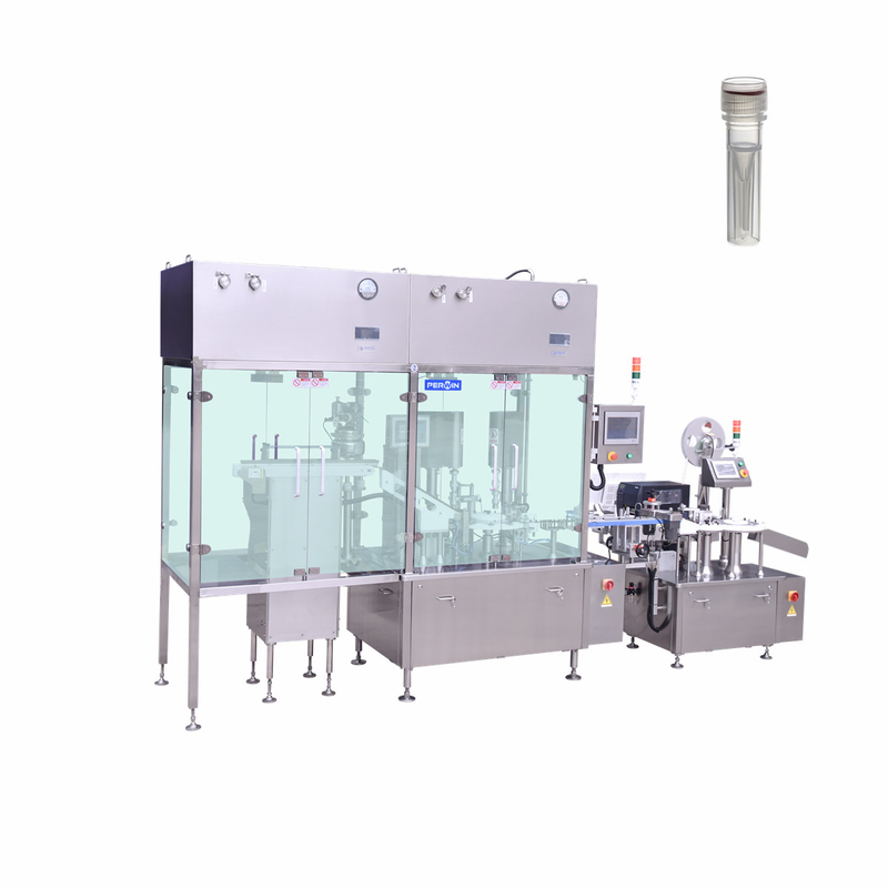 Wanneer flessen in het vulgebied komen, begint de machine automatisch met vullen en afdekken. (Optioneel: laminaire stromingsafdekking hierboven, voor een volledig aseptische omgeving.)